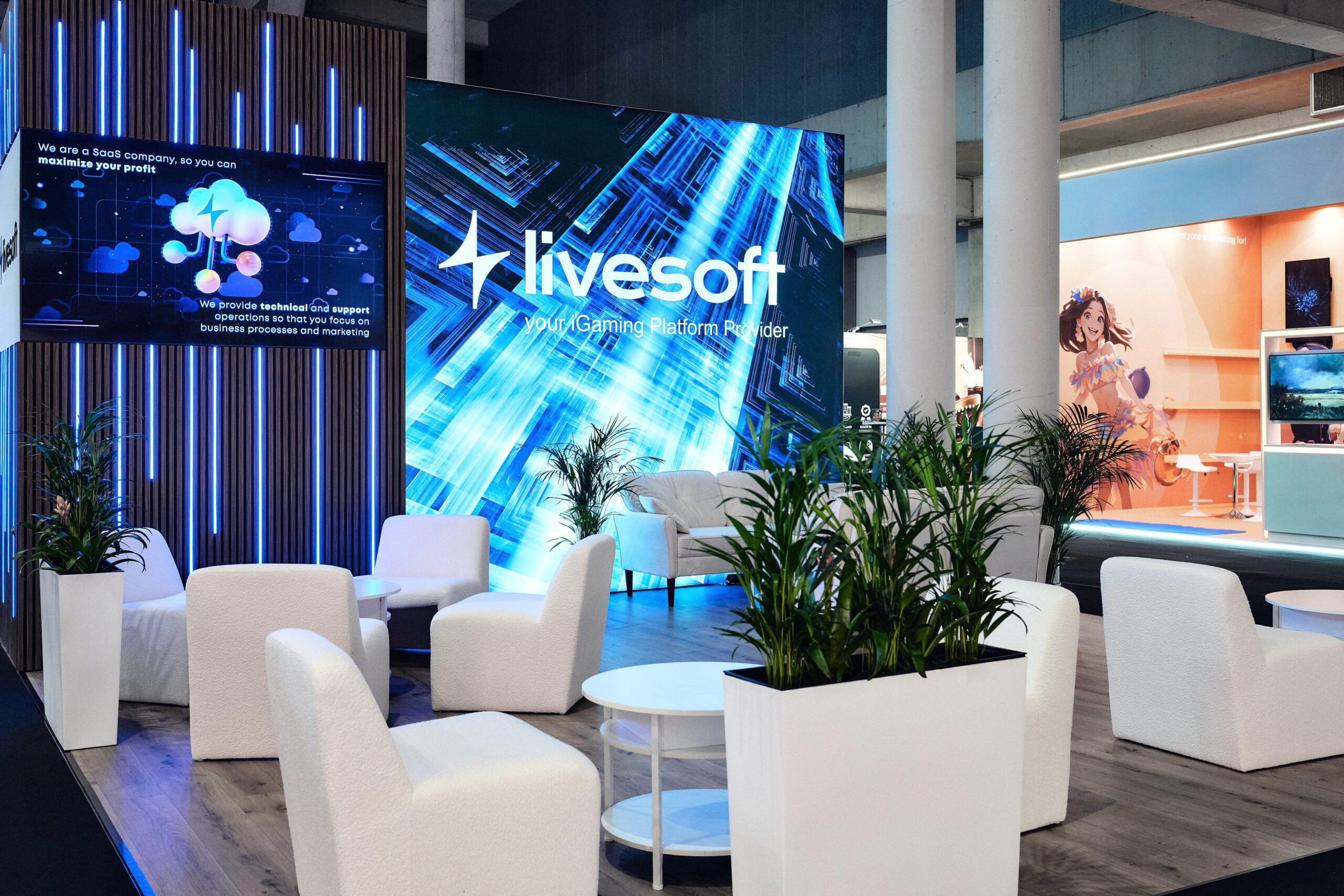 Custom photo zones, polygonal shapes, neon signs, and scenery.